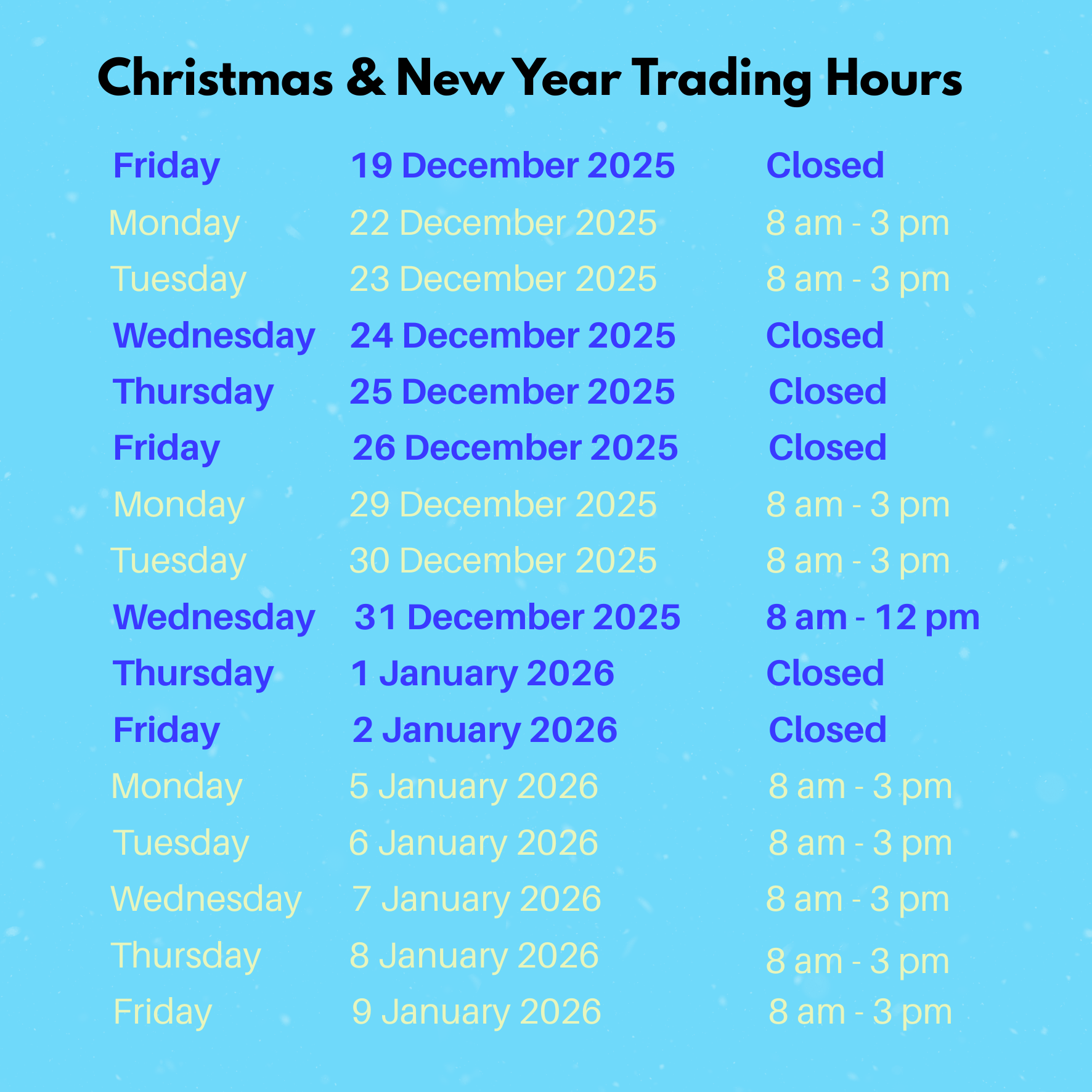 During the Christmas & New Year period, our office will be open, please refer to above trading hours.